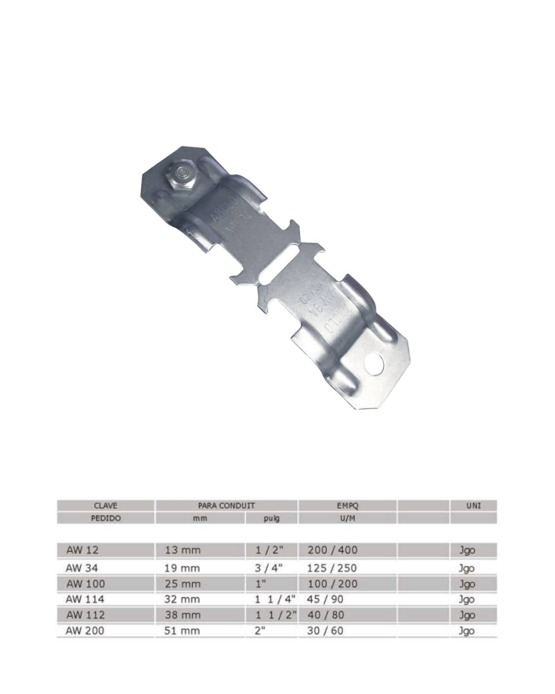 Abrazadera para tubo conduit pared delgada (EMT) modelo AW marca Anclo. Fabricada en acero galvanizado de alta resistencia con acabado zincado que proporciona excelente protección contra la corrosión. Diseñada para sujetar tubería EMT a sistemas de soporte tipo unicanal o estructuras metálicas. Incluye tornillo de fijación y rosca integral, lo que permite una instalación rápida y segura sin necesidad de tuerca adicional. Cumple con las normas NOM y UL. Disponible para diámetros desde ½” hasta 2”. Ideal para instalaciones eléctricas comerciales e industriales donde se requiere montaje eficiente y duradero.