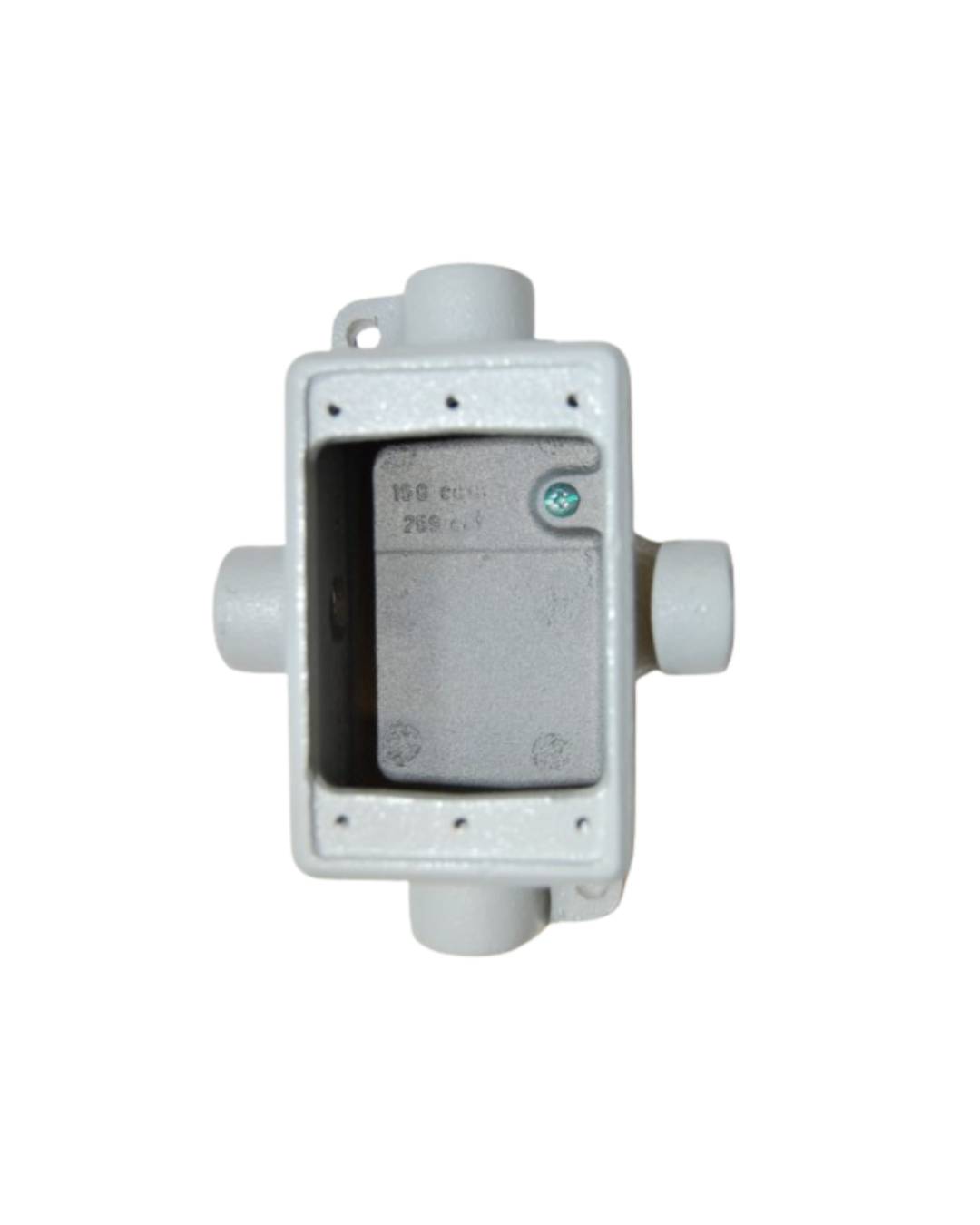 Caja rectangular FSX de aluminio galvanizado con tres salidas, ideal para derivaciones eléctricas en sistemas conduit.Disponible en medidas de ½”, ¾” y 1”