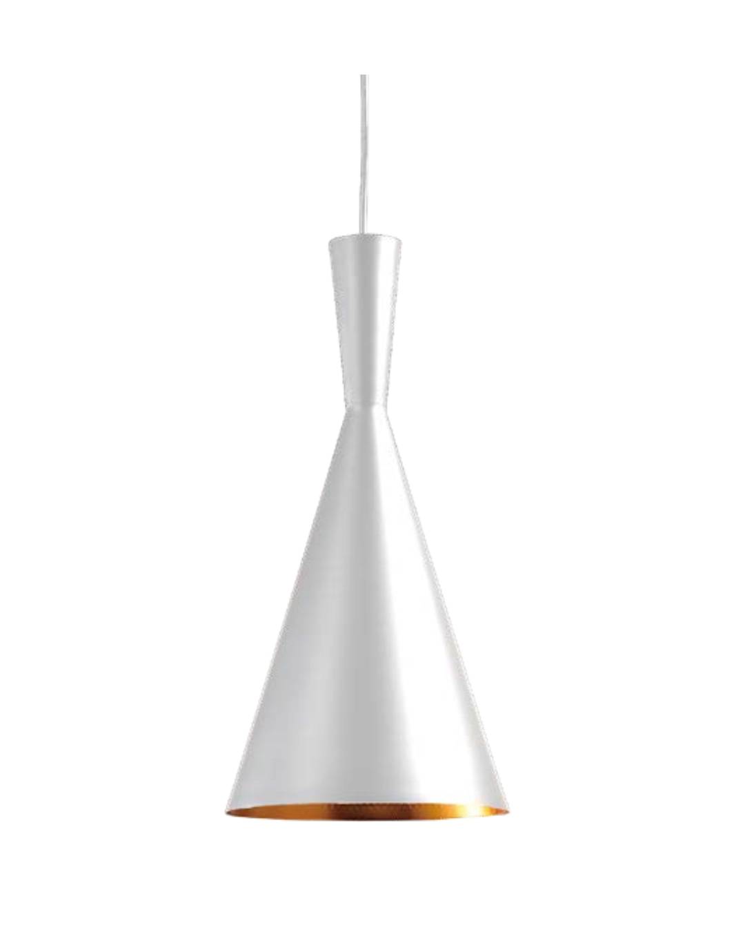 Campana blanca, interior anodizado dorado, base metalica, cable blanco 1xE26, no incluye focos, medida19cm de diametro x 37.2cm mas 1.2m de cable