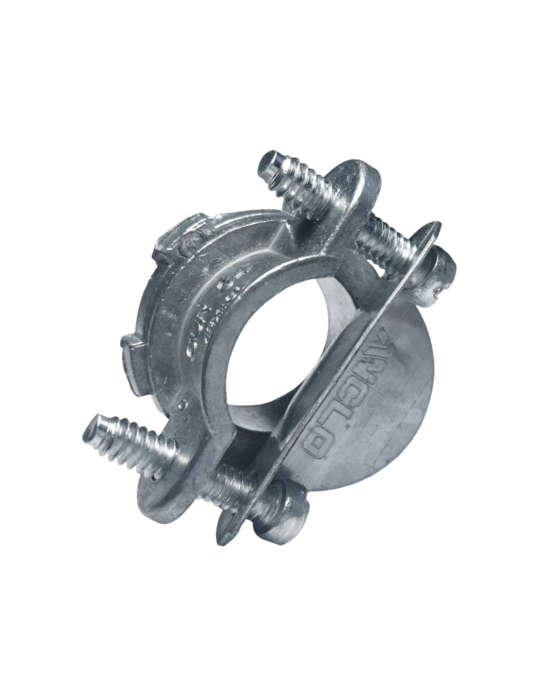 Conector metálico Anclo fabricado en zamak galvanizado, diseñado para sujetar y proteger cables flexibles o blindados en instalaciones eléctricas.