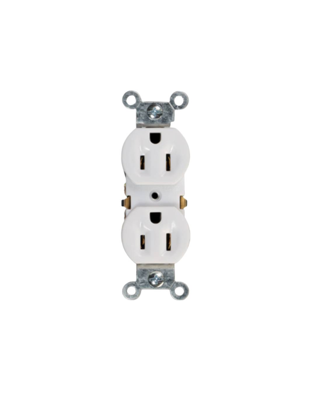 Contacto doble polarizado modelo SE-270M marca Supplier. Fabricado en cuerpo termoplástico de alta resistencia color Blanco, con estructura metálica galvanizada para montaje en caja estándar. Diseñado para corriente nominal de 15 amperes y tensión de 127 voltios. Cuenta con sistema de conexión a tierra y tornillos de fijación en latón para una sujeción firme y segura del conductor. Cumple con normas NOM y UL, ideal para instalaciones residenciales, comerciales y de oficina.