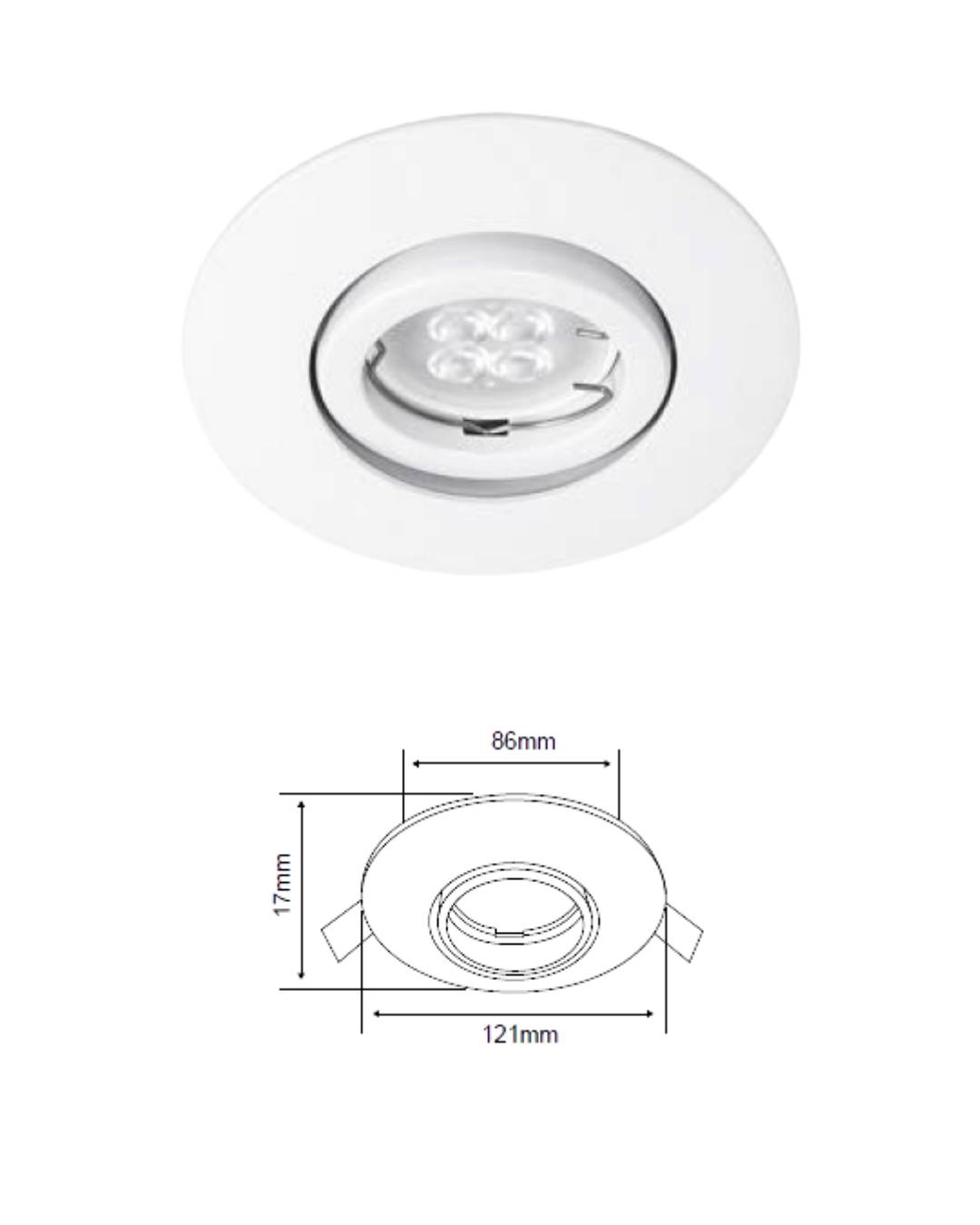Lámpara Downlight Empotrable Dirigible, Potencia Máx. 6 W, Base GX5.3, Foco MR16 no incluido.Accesorios de conexión y montaje incluidos. Medidas: diametro interior 8.6cm , diámetro exterior 12.1 cm, altura:1.7 cm