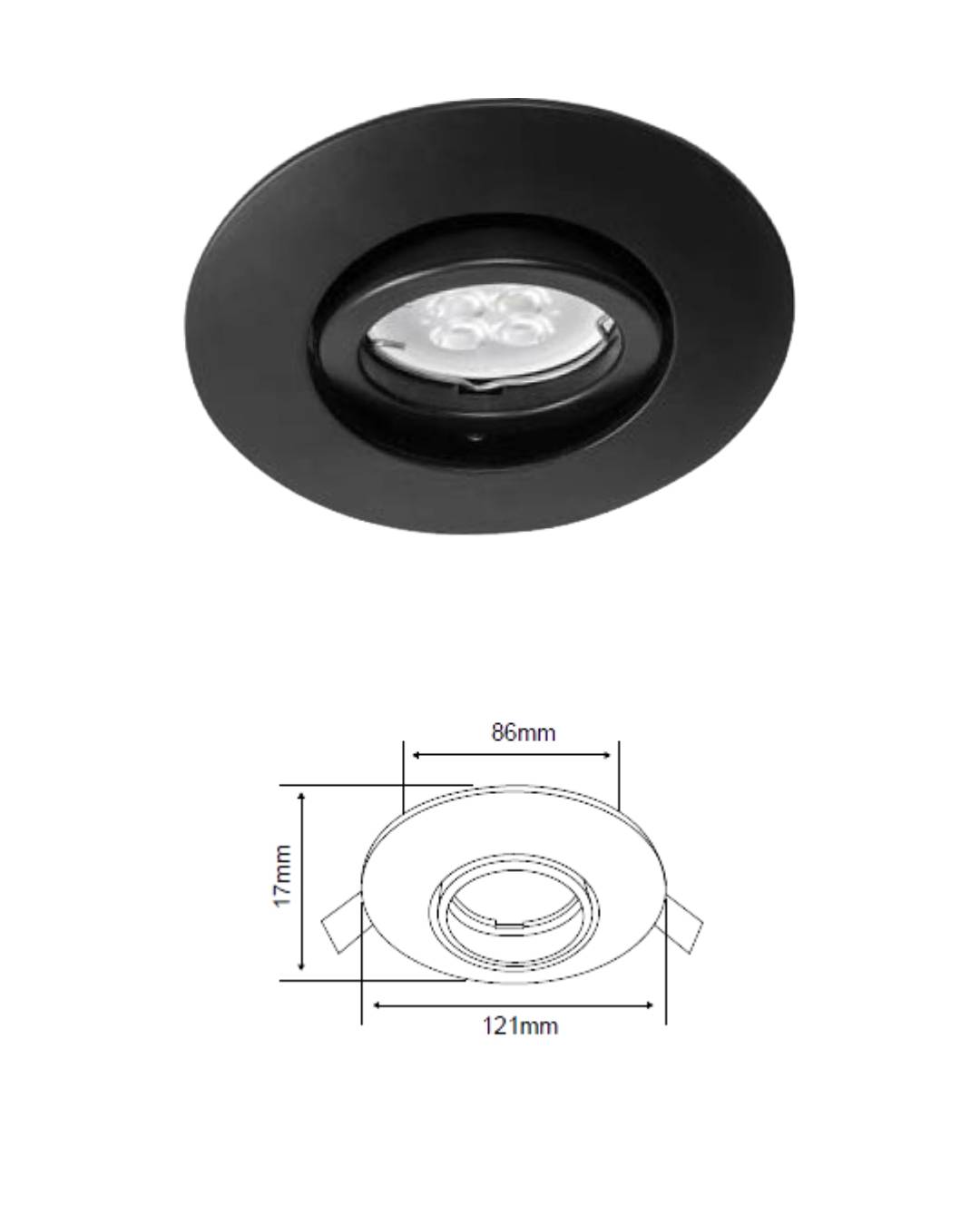 Lámpara Downlight Empotrable Dirigible, Potencia Máx. 6 W, Base GX5.3, Foco MR16 no incluido.Accesorios de conexión y montaje incluidos. Medidas: diametro interior 8.6cm , diámetro exterior 12.1 cm, altura:1.7 cm
