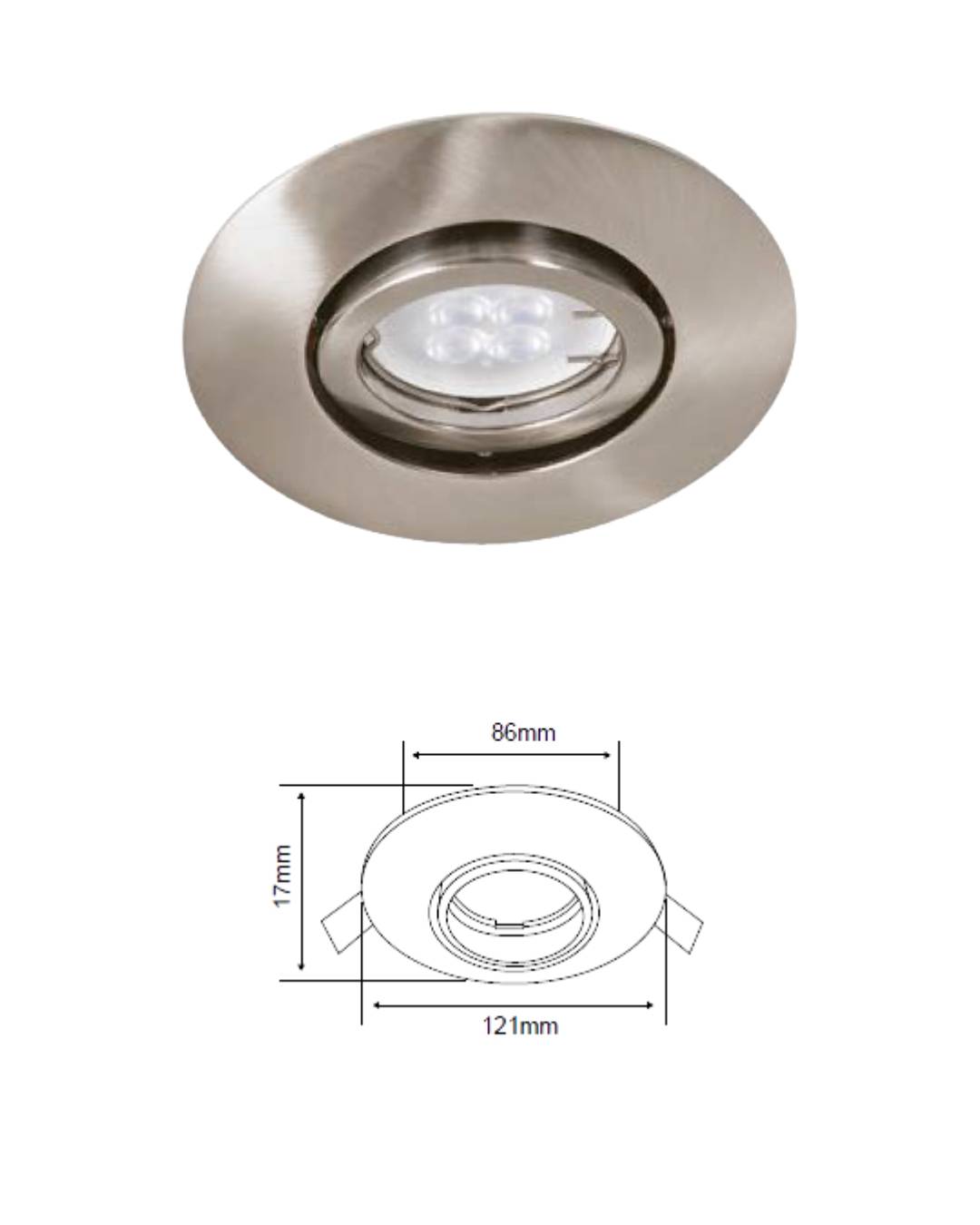 Lámpara Downlight Empotrable Dirigible, Potencia Máx. 6 W, Base GX5.3, Foco MR16 no incluido.Accesorios de conexión y montaje incluidos. Medidas: diámetro interior 8.6cm , diámetro exterior 12.1 cm, altura:1.7 cm