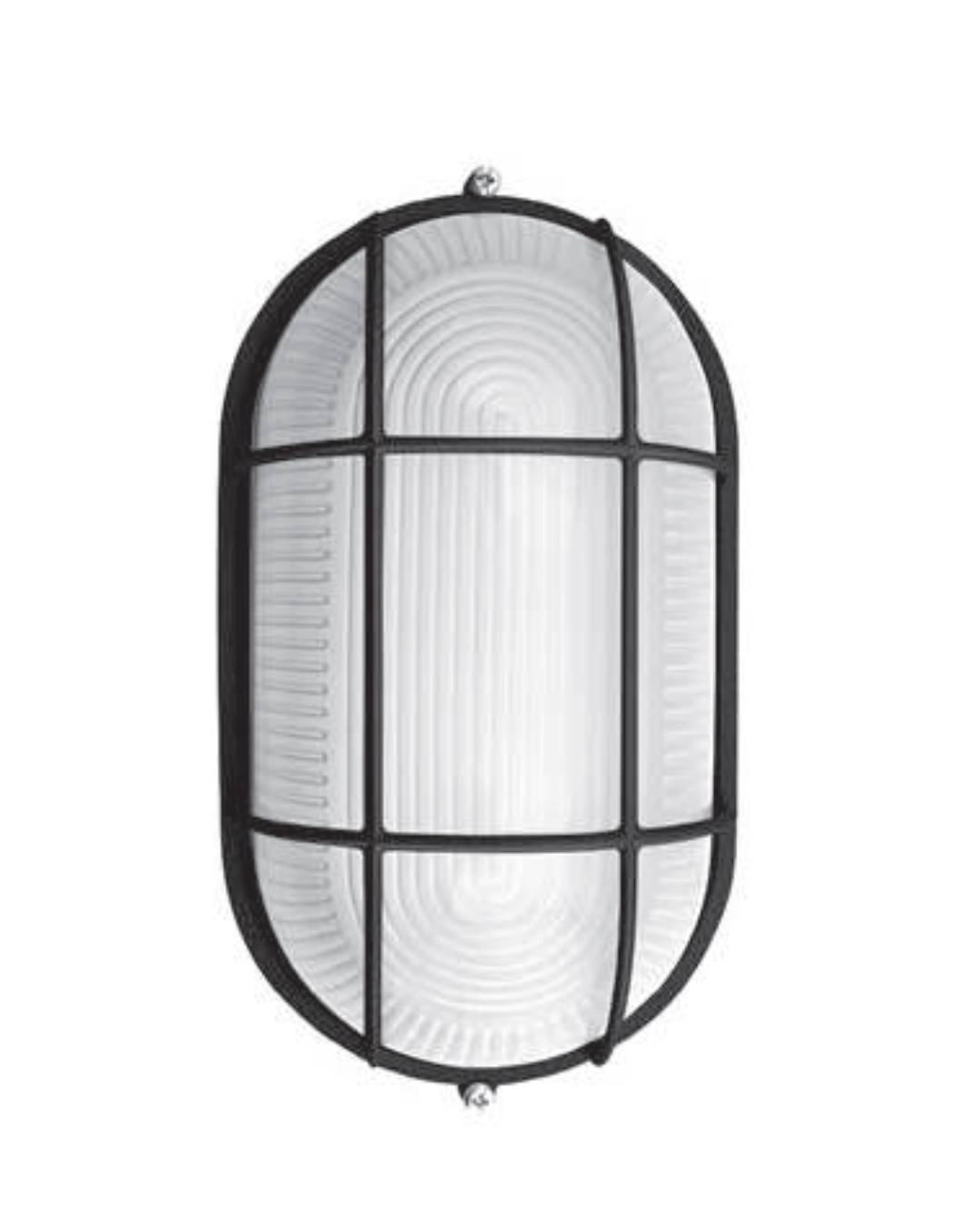 Lámpara tipo nautica negra, una luz, E26. Cuerpo de aluminio y vidrio. no incluye foco. IP54, medidas 105x210x85mm