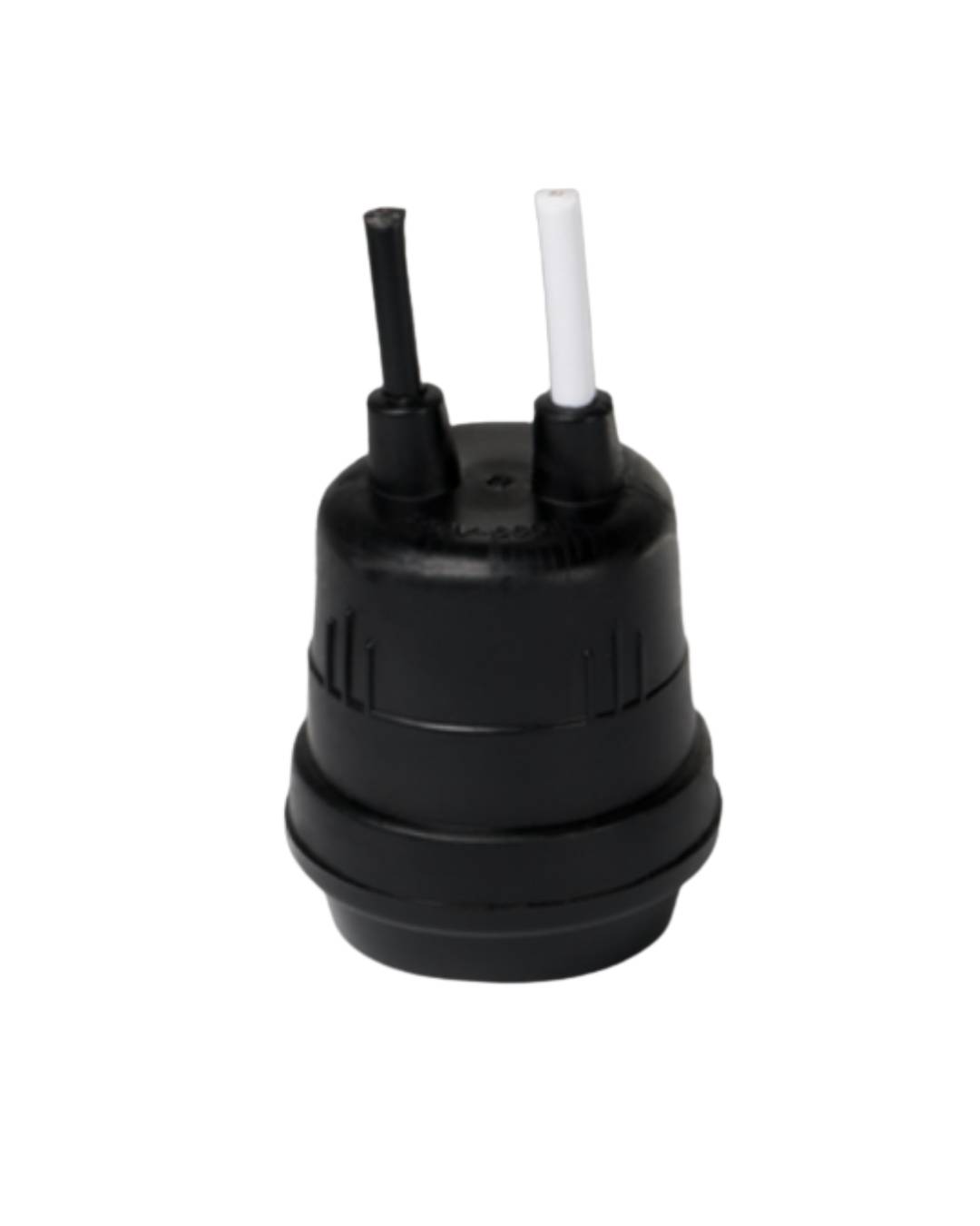 Portalámpara aislado negro, para exteior negro, con cables integrados, fabricado en plástico aislante color negro, ideal para instalaciones provisionales, talleres, bodegas o áreas de mantenimiento.