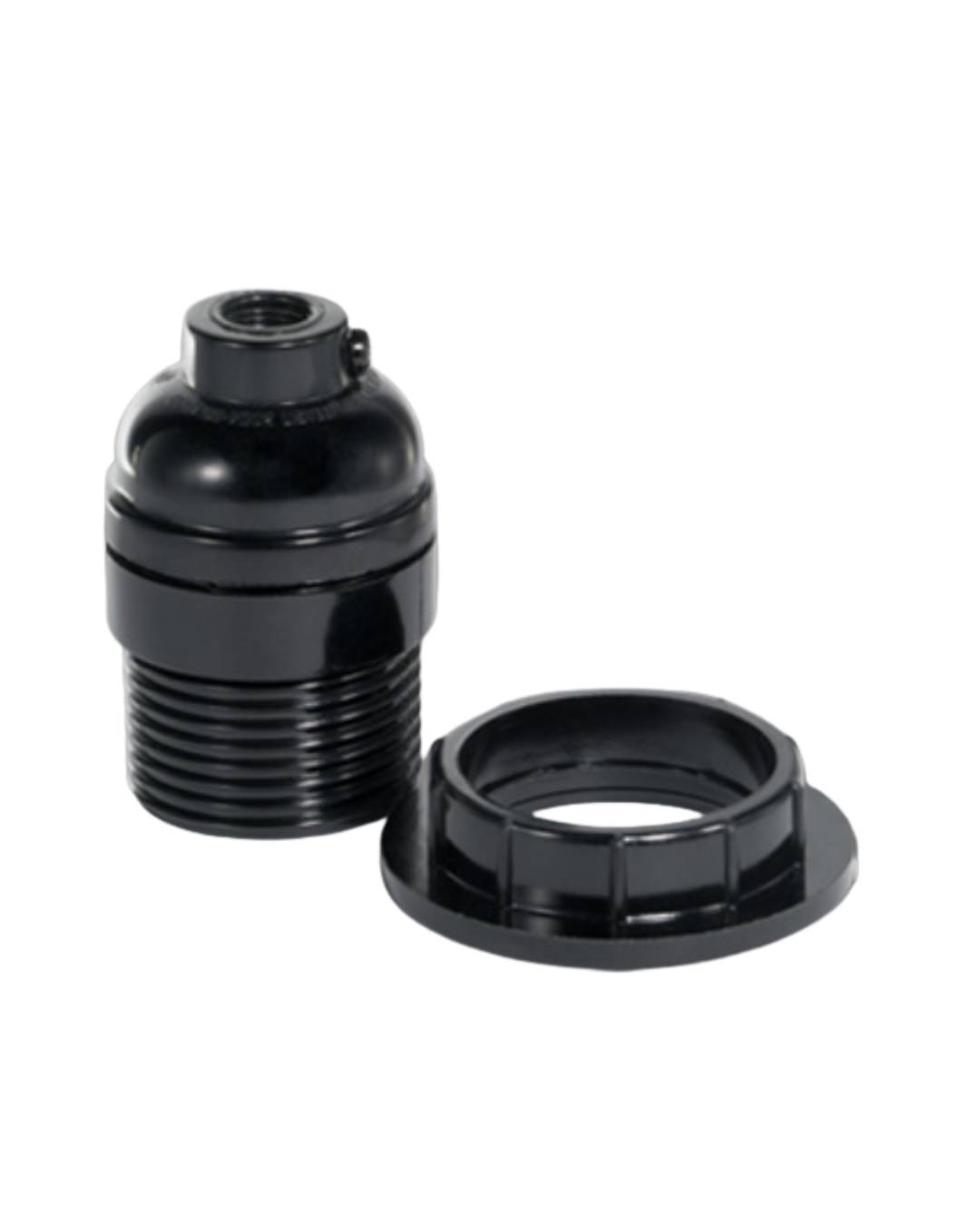 Portalámpara tipo E27 con anillo de sujeción, , fabricado en plástico aislante negro de alta resistencia. Ideal para lámparas colgantes, pantallas decorativas o instalaciones eléctricas residenciales e industriales. Para interior.