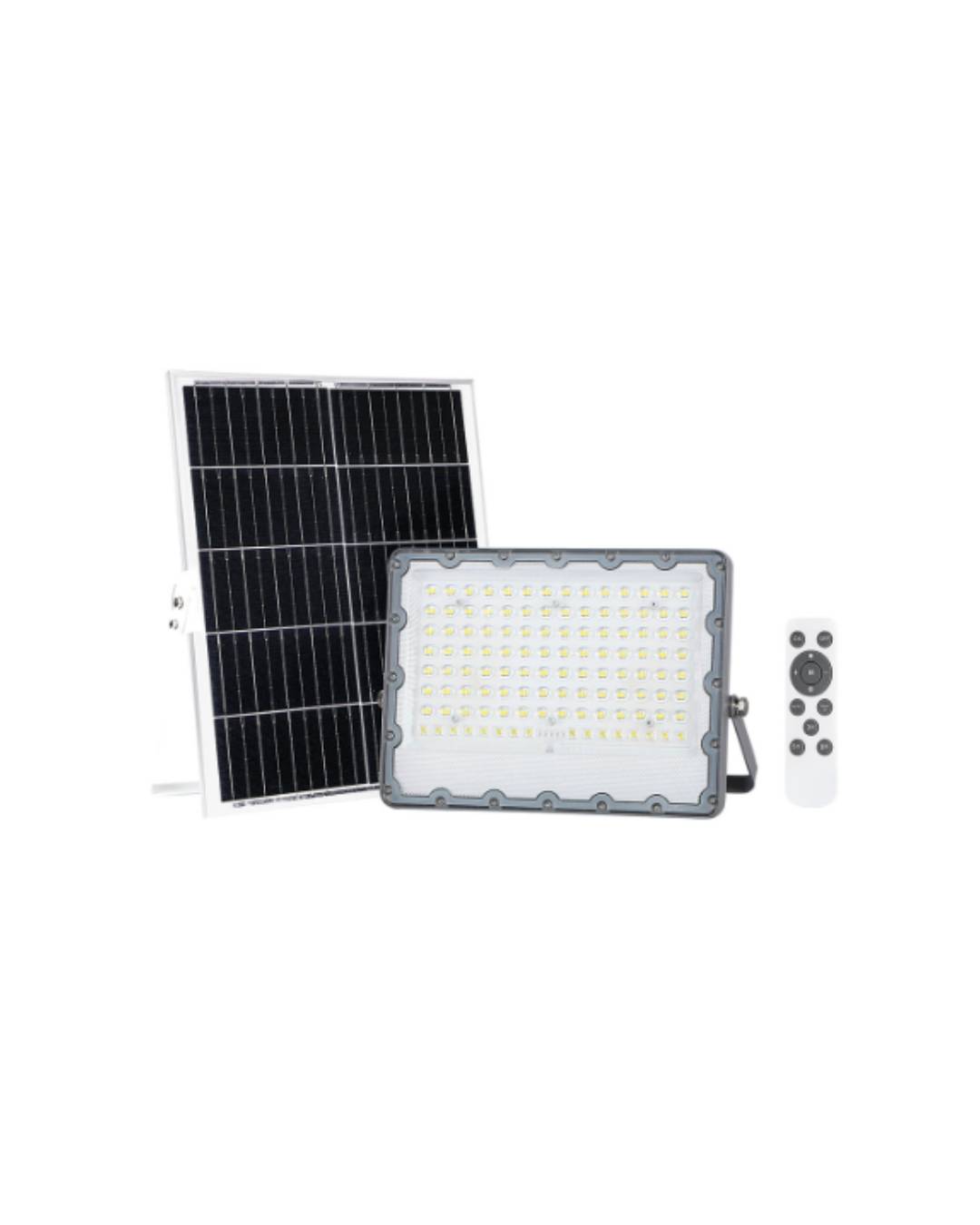 Reflector Solar con panel solar, controlador con tempotizador, sensor y bateria 2,300 lúmenes equivalencia a 200w, medida 272x199x41mm, material aluminio. IP65